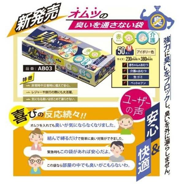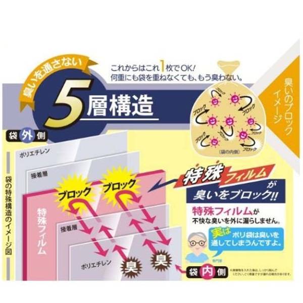 ポリ袋が5層になっており、真ん中の層に使用されている特殊な素材が臭いが外に漏れるのを強力にブロックします。 おむつ・ペットシート・生ごみ等の廃棄に。 非常時や災害時用の備えやレジャー・旅行向けにもおすすめです。 サイズ:230×380×0.030mm 素材:LLDPE 色:アイボリー 入数:100枚(50枚×2個)