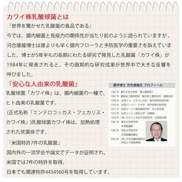 カワイ80は、乳酸球菌エンテロコッカス・フェカリス・カワイ株を主原料とし、長期にわたるたゆまぬ研究の成果から生産された乳酸球菌食品です。