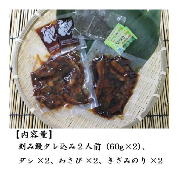 2人前の場合:刻み鰻タレ込み(60g×2)、ダシ×2、わさび×2、きざみのり×2