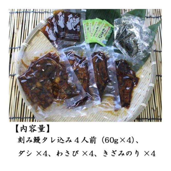 4人前の場合:刻み鰻タレ込み(60g×4)、ダシ×4、わさび×4、きざみのり×4