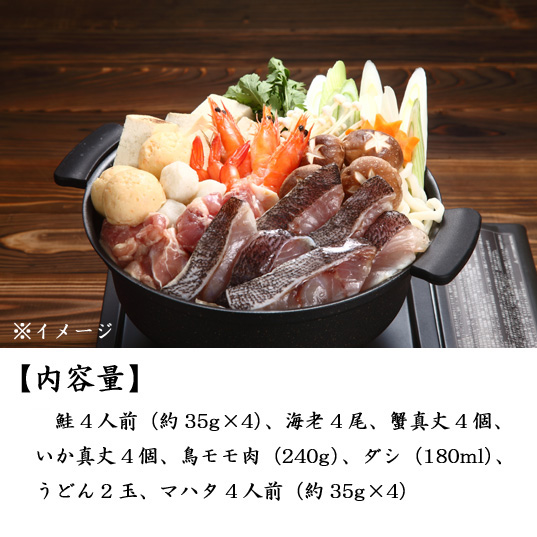 【内容量】マハタ4人前(約35g×4)・鮭4人前(約35g×4)・海老4尾・蟹真丈4個・いか真丈4個・鳥モモ肉(約240g)・ダシ(180ml)・うどん2玉