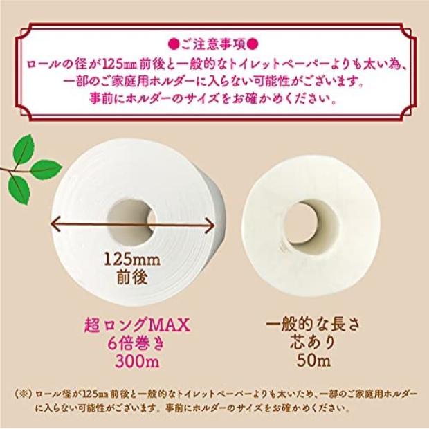 【ケース販売】芯なし超ロング トイレットペーパー 6倍巻き 300m シングル 2ロールx8パック